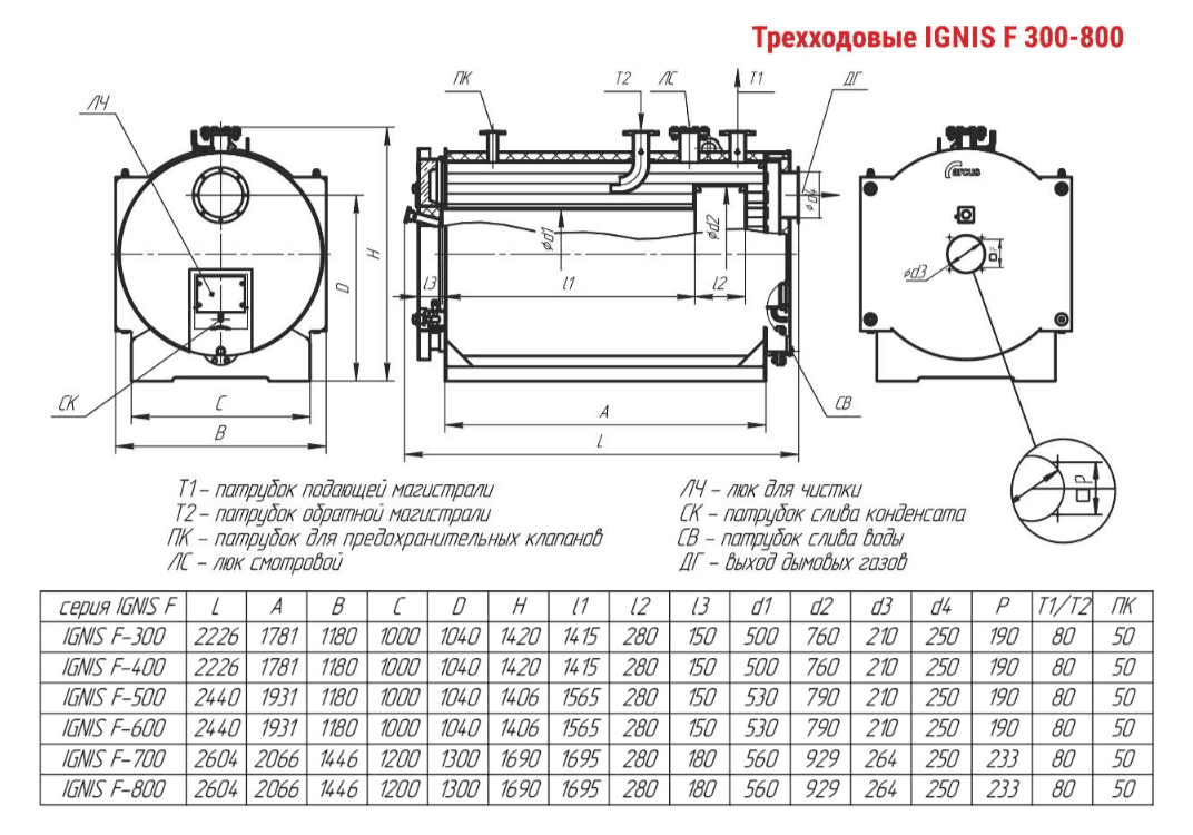 Технические характеристики водогрейного трёхходового котла ARCUS IGNIS F-500