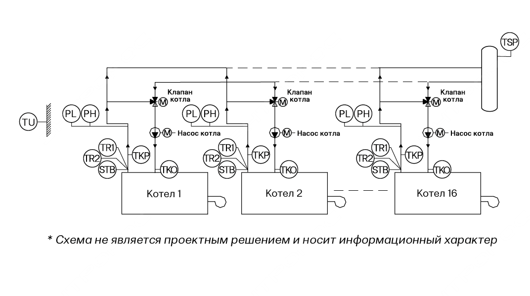 - управление котловыми насосами в соответствии алгоритмом рабочего режима КА;