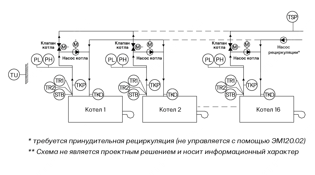- управление подпиточными котловыми насосами в соответствии алгоритмом защиты котлоагрегата;